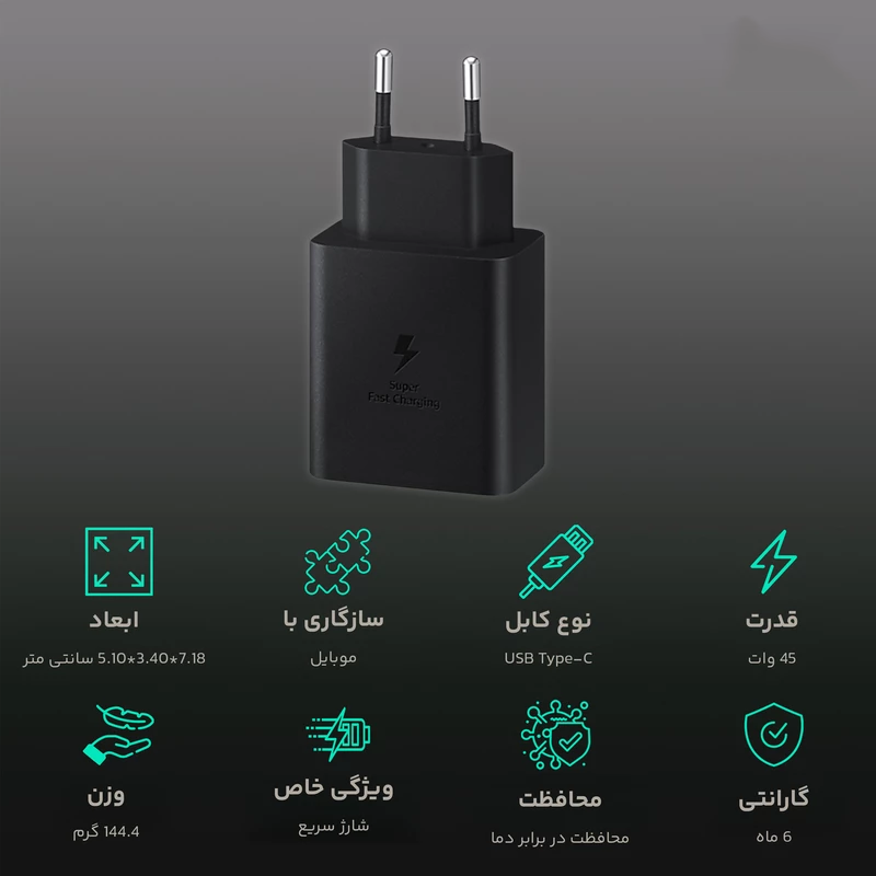 | توضیحات | ۶۰x۵۰x۲۰ میلیمتر ۴۵وات وزن ۱۲۳ گرم ولتاژ ورودی ۱۰۰-۲۴۰ ولت ولتاژ خروجی ۵ ولت شدت جریان خروجی ۲.۰ آمپر مخصوص تبلت و موبایل , ۳.۰ آمپر مخصوص تبلت و موبایل تعداد درگاه خروجی ۱ عدد نوع درگاه خروجی USB-C توضیحات در ادامه لیست دستگاههای سامسونگی که این سوپر فست شارژر ۴۵ واتی را پشتیبانی میکنند= – Samsung Galaxy S۱۰ ۵G – Samsung Galaxy S۱۰e – +Samsung Galaxy S۱۰ – Samsung Galaxy S۱۰ – Samsung Galaxy Note۱۰ – +Samsung Galaxy Note۱۰ – Samsung Galaxy Note۱۰+ ۵G – Samsung Galaxy Note۱۰ Lite – Galaxy Note۲۰ – Samsung Galaxy Note۲۰ Ultra – Samsung Galaxy S۲۰ – +Samsung Galaxy S۲۰ – Samsung Galaxy S۲۰ Ultra – Samsung Galaxy S۲۰ Ultra ۵G – Galaxy S۲۰ FE – Samsung Galaxy S۲۰ FE ۵G – Samsung Galaxy S۲۱ – Samsung Galaxy S۲۱ Ultra – Samsung Galaxy A۷۰ – Samsung Galaxy A۷۰s – Samsung Galaxy A۸۰ – Samsung Galaxy A۹۰ ۵G – Samsung Galaxy Z Flip – Samsung Galaxy Z Fold۲ |