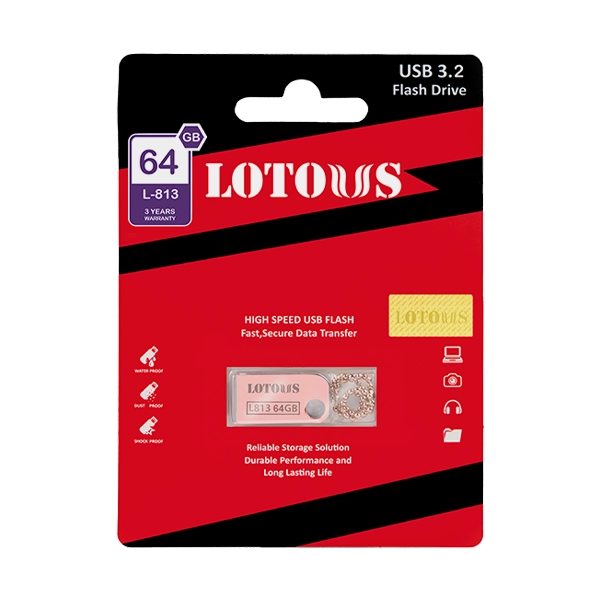 فلش مموری لوتوس مدل L-813 ظرفیت 64 گیگابایت، با کیفیت بسیار عالی، مقاوم در برابر شوک و لرزش، مقاوم در برابر گرد و غبار و ضد آب است. این فلش مموری دارای ظرفیت 64 گیگابایت بوده که امکان ذخیره سازی تعداد قابلی توجهی فایل های صوتی و تصویری را فراهم می کند. فلش مموری L-813 از رابط USB3.2 بهره می برد که باعث میشود سرعت انتقال اطلاعات شما بسیار بالا باشد.