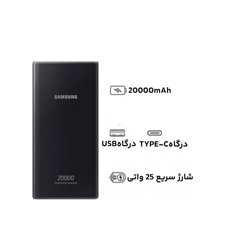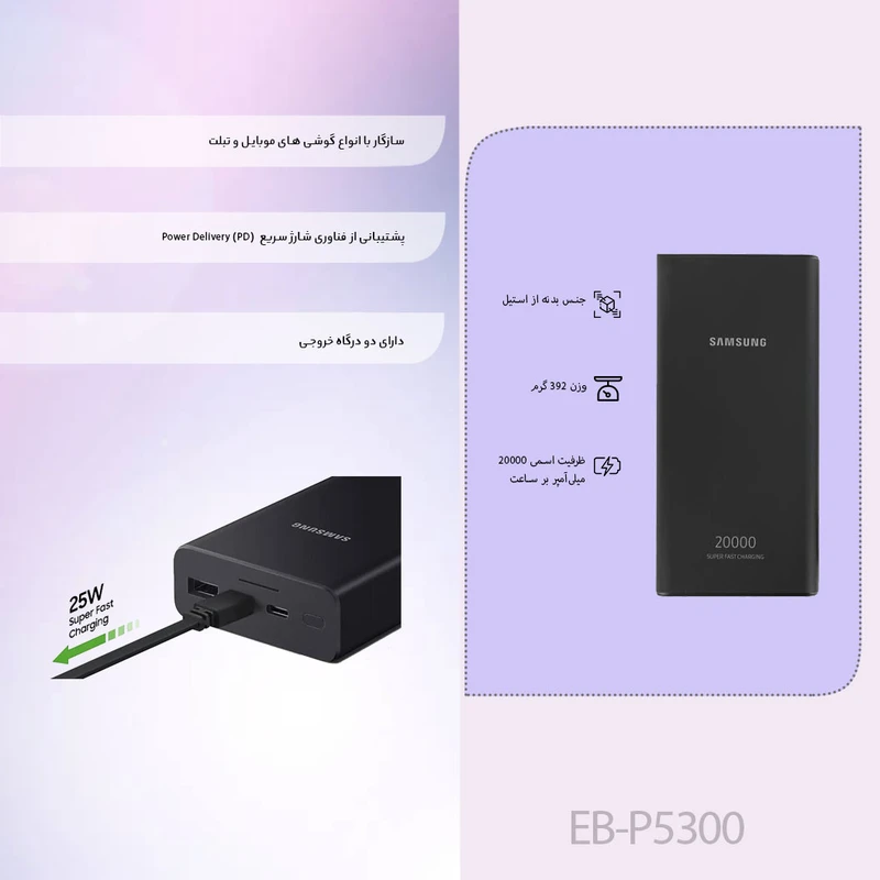 در عصر مدرن که تمامی کارهایی که باید در طول روز انجام شود به صورت اپ و در گوشی قرار گرفته است به یک شارژر همراه نیاز خواهیم داشت. البته این تنها استفاده‌ی این محصول نیست و برای شارژ کردن لپ‌تاپ و حتی تبلت نیز باید از همین مورد استفاده کنید. تصور کنید هر روز بعد از کار باید با تبلت در کلاس آنلاین خود شرکت کنید، در این صورت زمانی که از سرویس برگشت شرکت استفاده می‌کنید به صورت همزمان در کلاس خود حاضر می‌شوید و با استفاده از پاوربانک از تمام نشدن شارژ تبلت اطمینان حاصل می‌کنید. شارژر همراه پاوربانک سامسونگ مدل EB-P5300 در ظرفیت 20000 میلی‌آمپر تولید و عرضه می‌شود و به شما این امکان را می‌دهد تا دو دستگاه مجزا را به صورت همزمان شارژ کنید. این محصول این امکان را به شما می‌دهد تا از فناوری شارژ سریع استفاده کنید و بدنه‌ی این محصول برای اطمینان از مقاوم بودن آن از فلز ساخته شده است.
